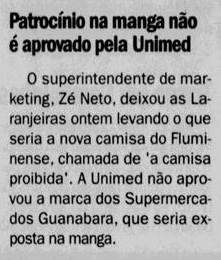 Patrocínio Supermercados Guanabara, barrado pela figura da Unimed, exigia-se exclusividade. Pouca edições da camisa foram feitas. Fontes: Jornal dos Sports, O Globo, Jornal do Brasil, Coleção Fluminense.