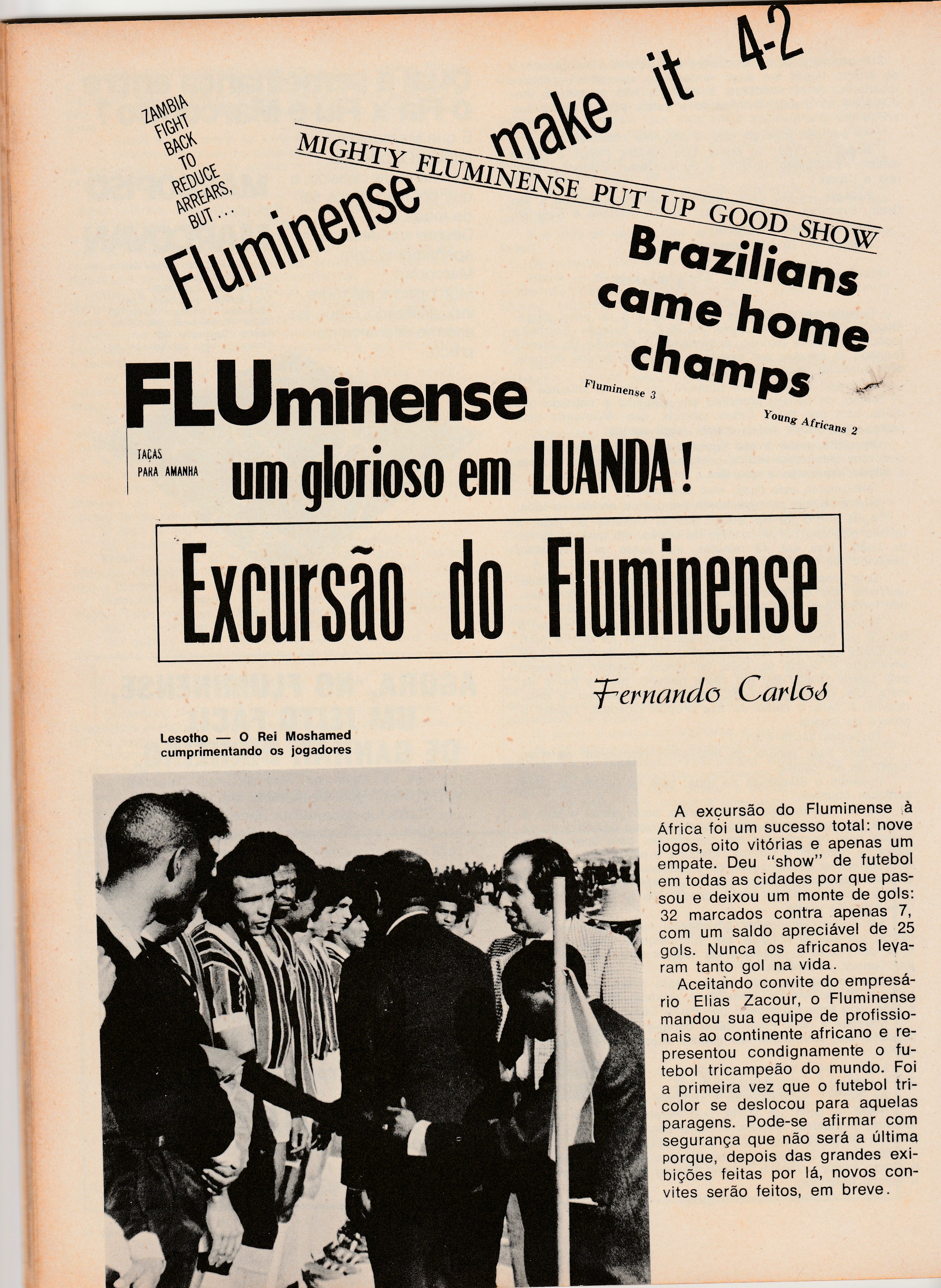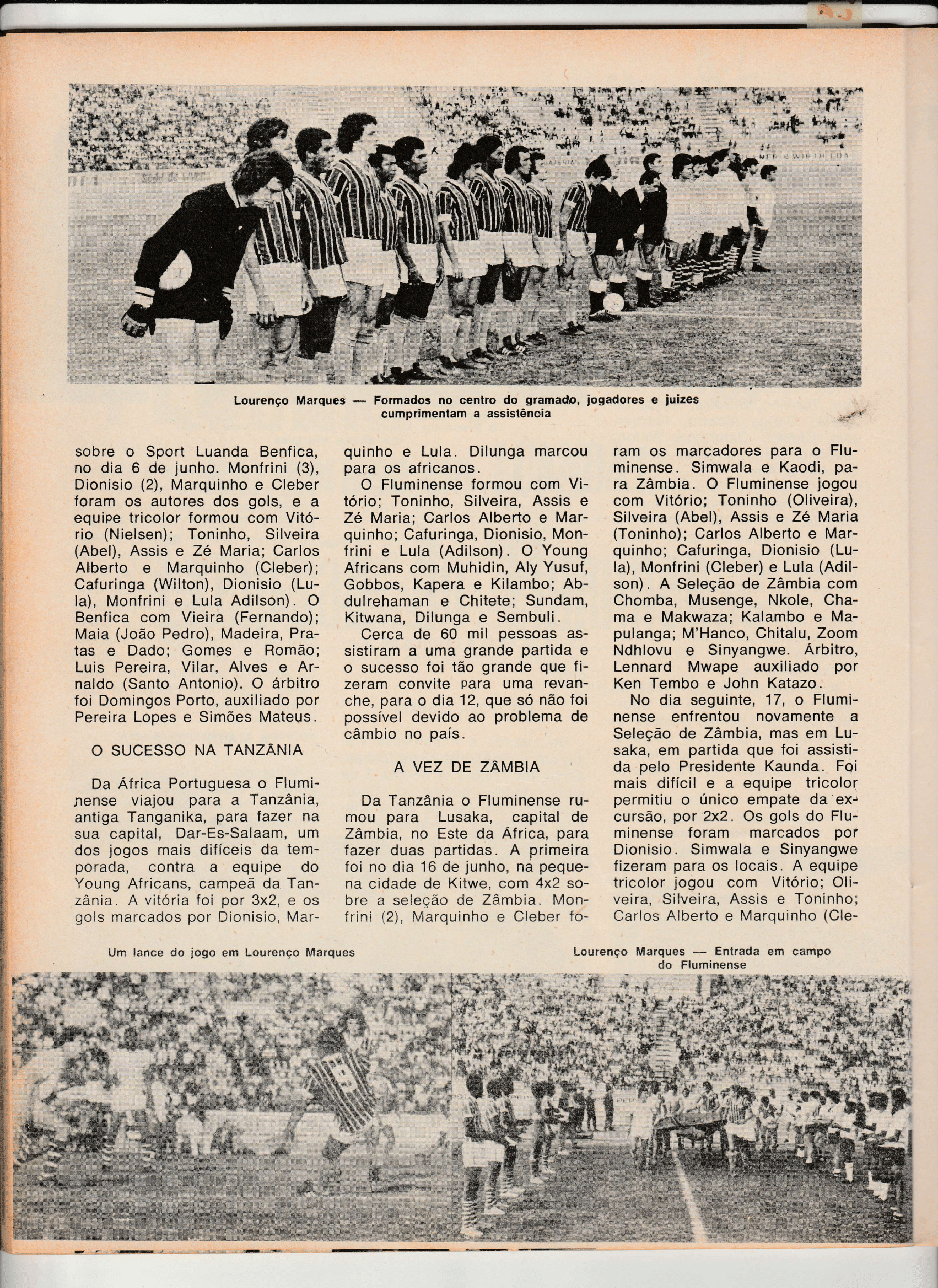 Primeira excursão do Fluminense à África – 1973. Sempre recebidos por chefes de Estado, foram nove jogos, oito vitórias e apenas um empate. O convite foi feito pelo empresário Elias Zacour. Fizeram escala na África do Sul, dali partiram para Angola onde jogaram em Luanda e Nova Lisboa. Em seguida jogaram nas capitais da Tanzânia, Zâmbia, Moçambique e Lesotho, respectivamente, Dar-Es-Salaam, Lusaka, Lourenço Marques (atualmente Maputo) e Maseru. Dionísio foi o artilheiro com 14 gols, Monfrini o vice com 8. O clube embolsou 27 mil dólares, ou Cr$ 145 mil.