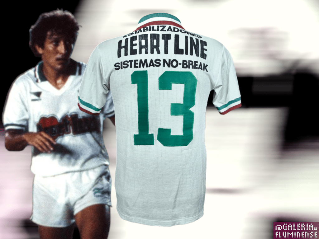 Acervo – Camisa utilizada pelo time profissional de futebol do Fluminense em 1986, confeccionada pela Penalty e estampada com o patrocínio da marca de estabilizadores Heartline Sistemas No-break.